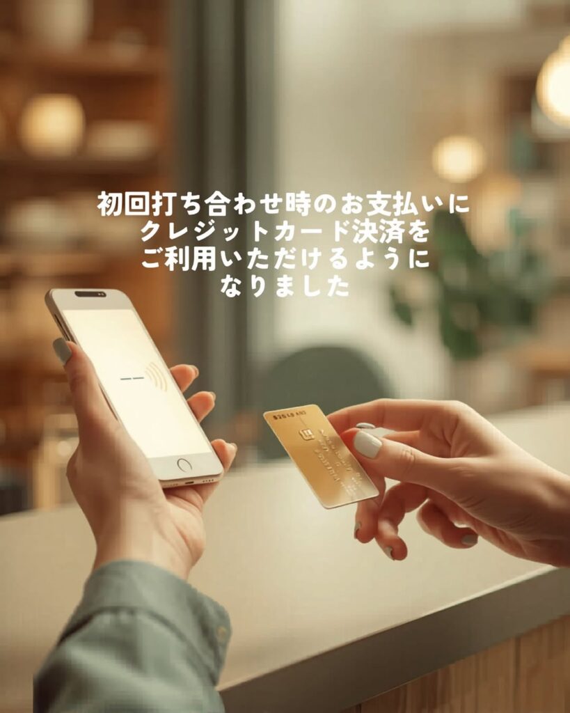 初回打ち合わせ時のお支払いで、クレジットカードタッチ決済をご利用いただけるようになりました。少しでも安心してご利用いただけるよう、環境を整えてまいります。初めての方も、どうぞお気軽にお問い合わせください。